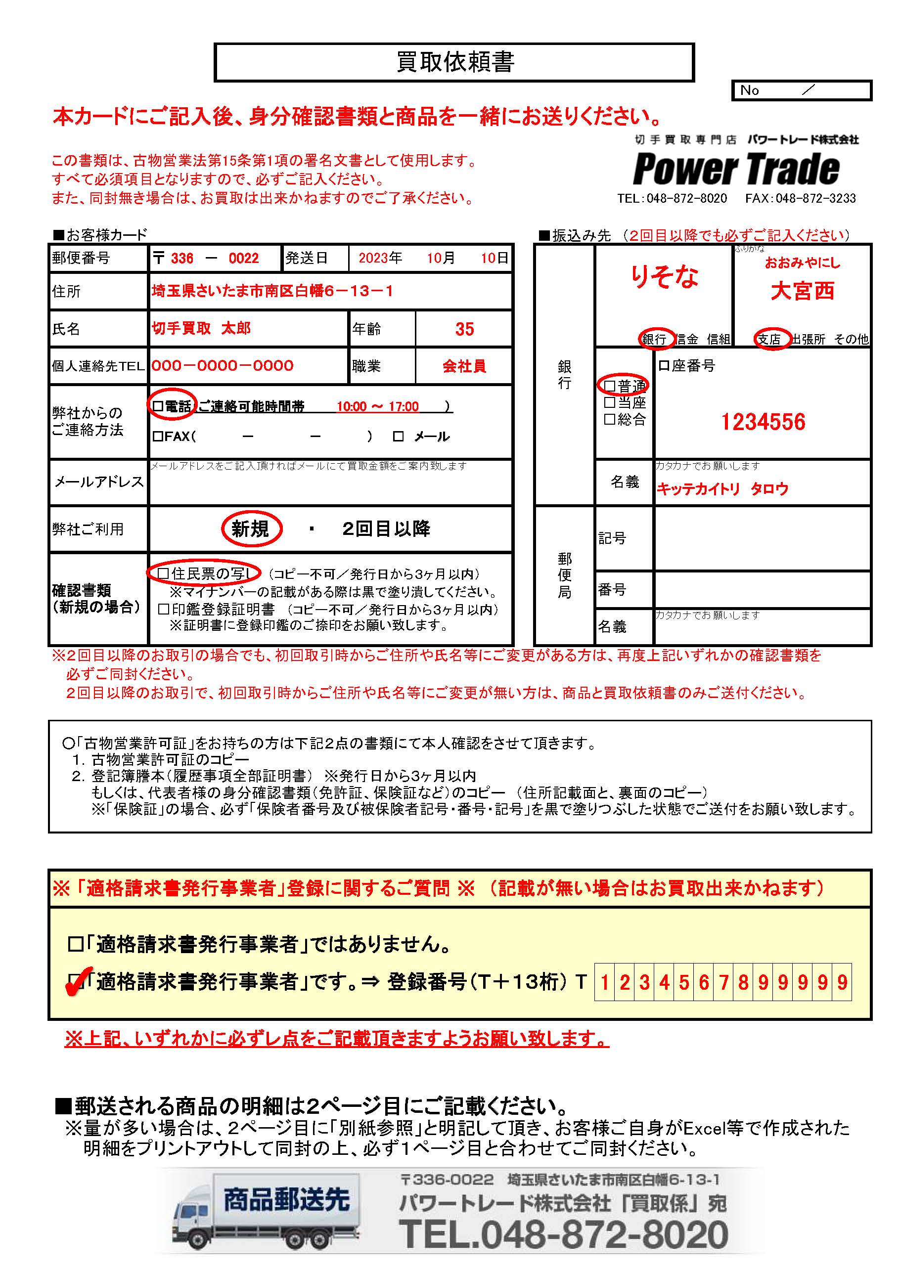 お客様にて記載の上、お送りください。